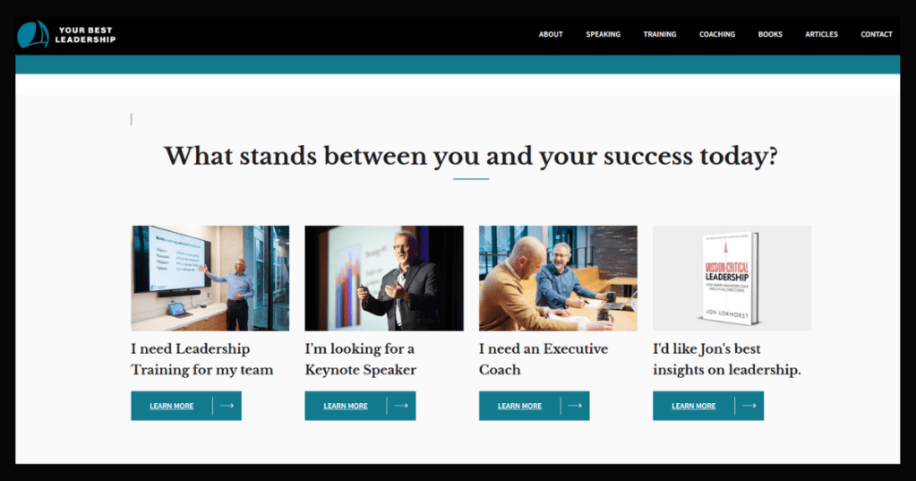 Client. There are an estimated 60,000 business coaches and 40,000 professional speakers in the United States today. How do you choose among the thousands? I worked with Jon Lokhorst (coach, speaker, trainer, and author) to develop his messaging strategy and upgrade his website in tandem with his book launch in 2021. The key? Recognizing that the site’s visitor needs to take a weight off their shoulders. That weight could be a stalled career, a disconnected team, or an urgent need for a keynote speaker.